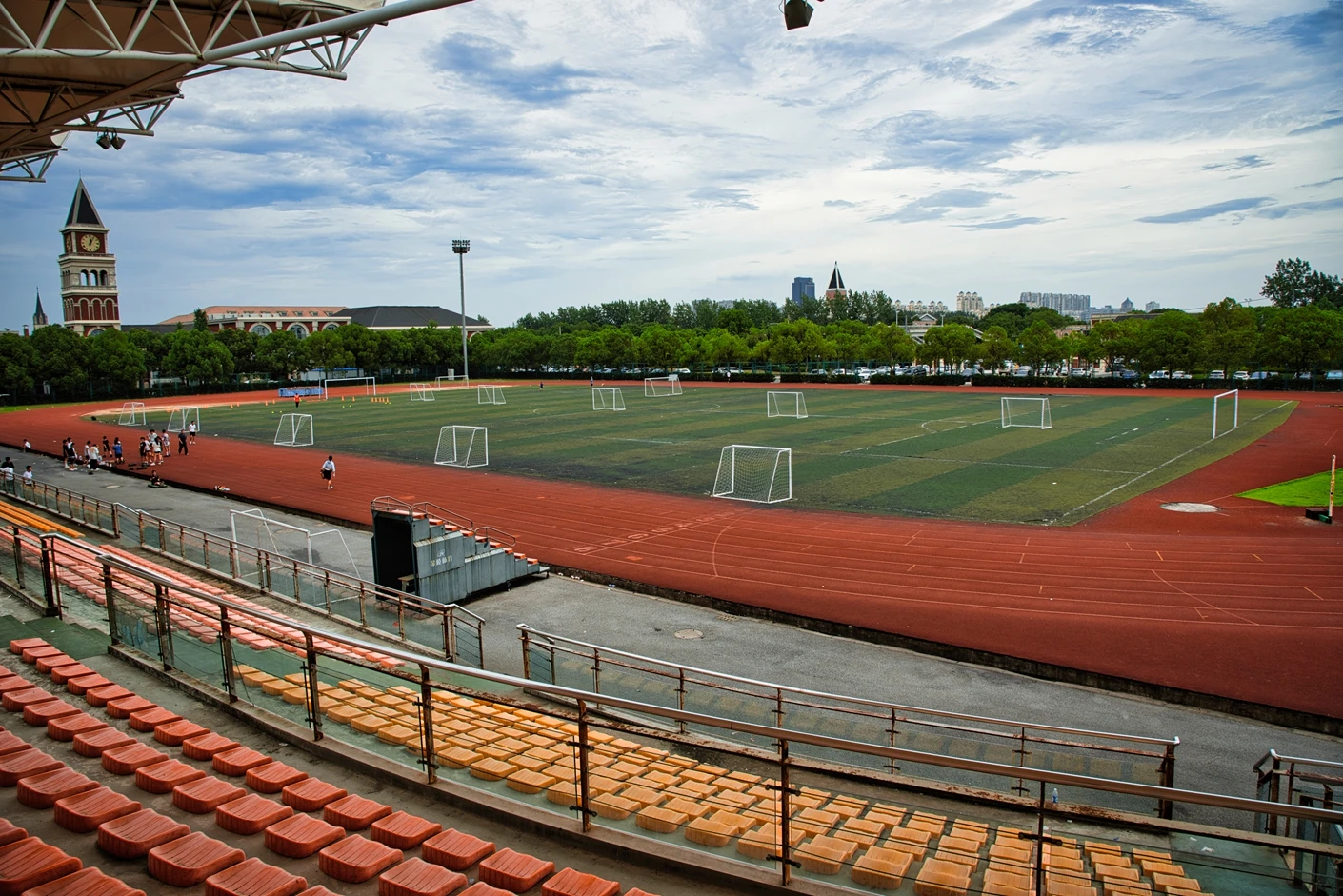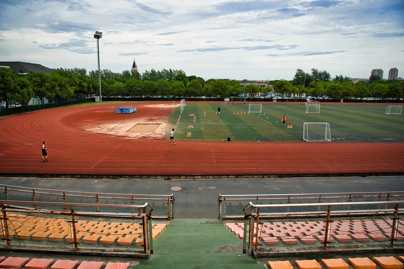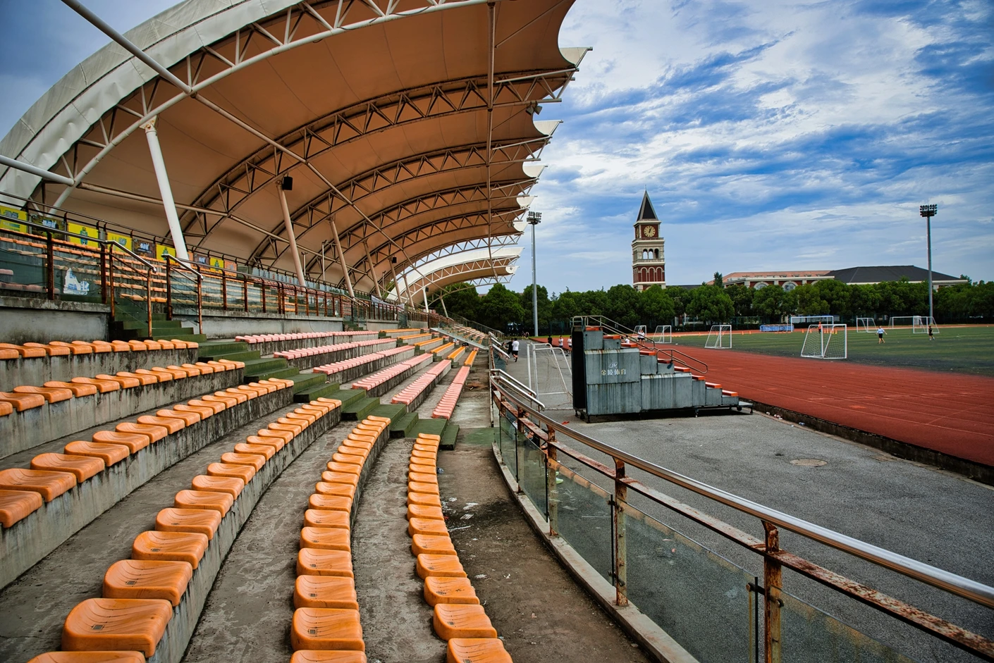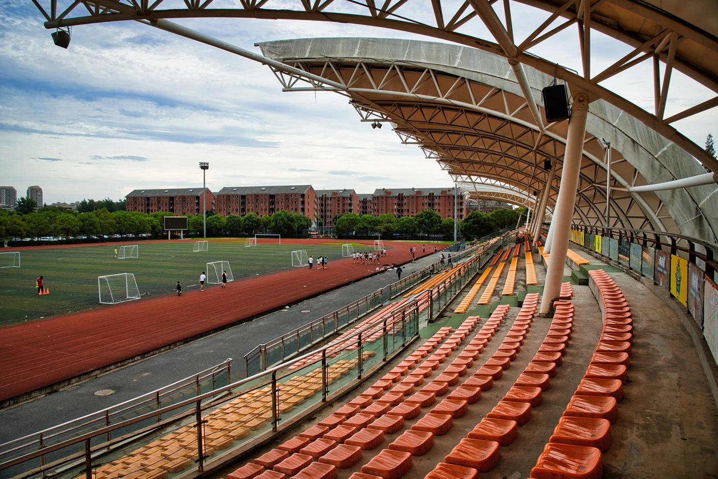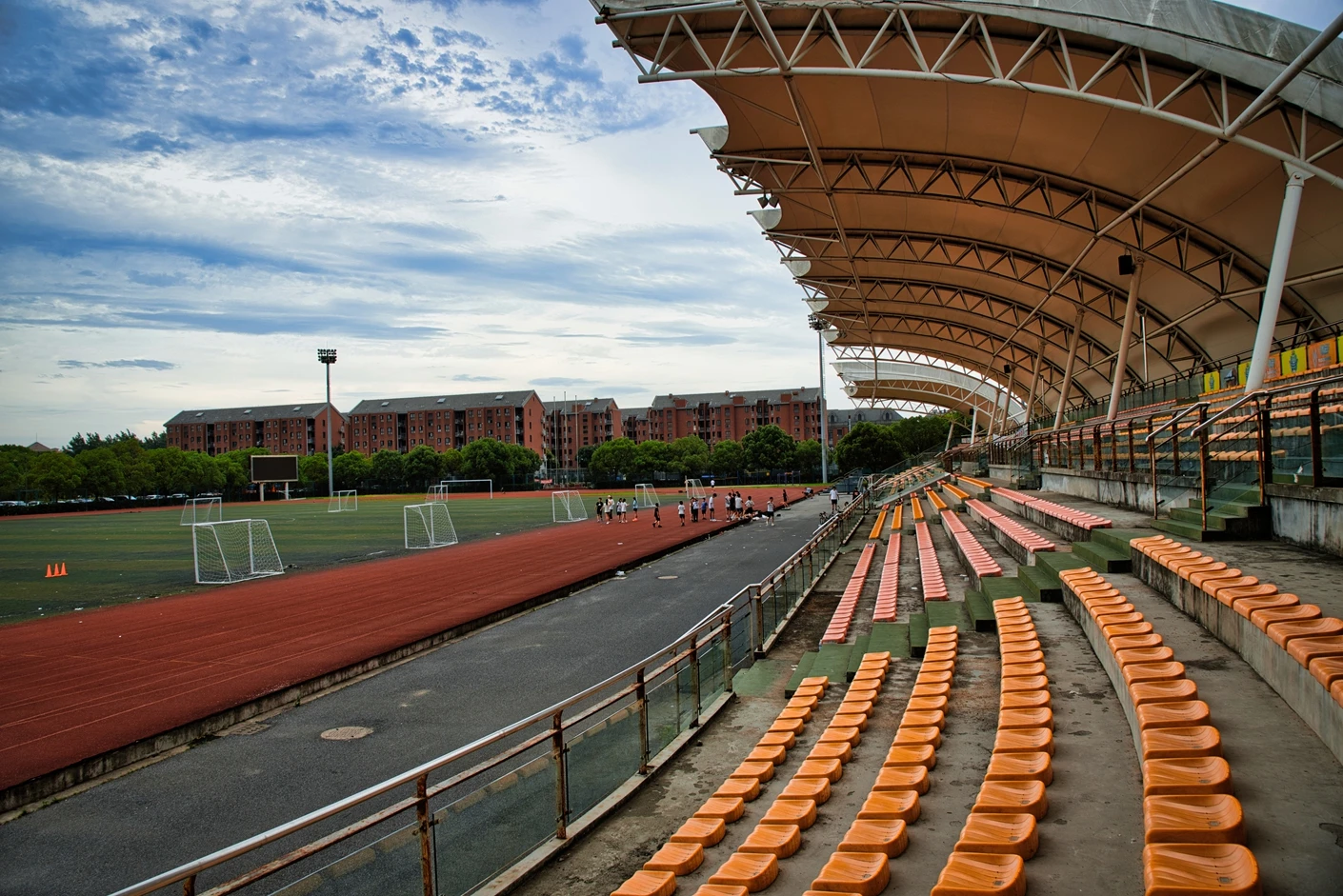 该体育场整体规划科学、硬件配置对标专业标准,核心区域涵盖8 跑道标准田径场与人工草坪标准足球场,为师生提供了安全优质的运动空间。田径场跑道采用高品质塑胶材质,弹性适中、防滑耐磨,能有效缓冲运动冲击力,降低运动损伤风险;足球场人工草坪经过专业翻新升级,在沥青地基与草皮间增设了海绵缓冲垫,触感柔软舒适,兼具出色的排水性能,保障全天候运动需求。场地功能分区明确,配套设施一应俱全,设有专业沙坑、铅球场等田径项目专用场地,满足跳远、三级跳、铅球等多种竞技项目的教学与训练需求;配备的专业音响系统,音质清晰、覆盖全面,为运动会、开幕式等大型活动提供稳定的音频支持。