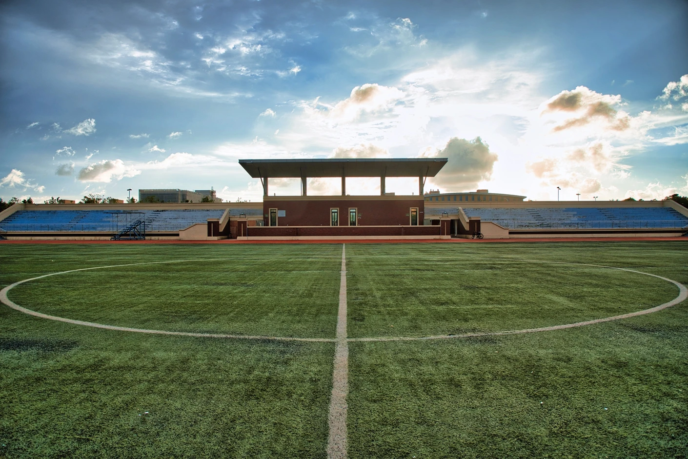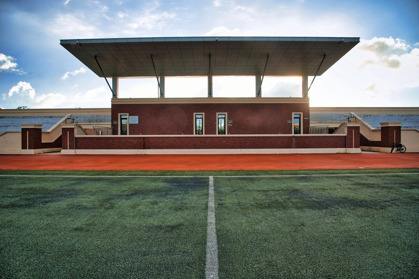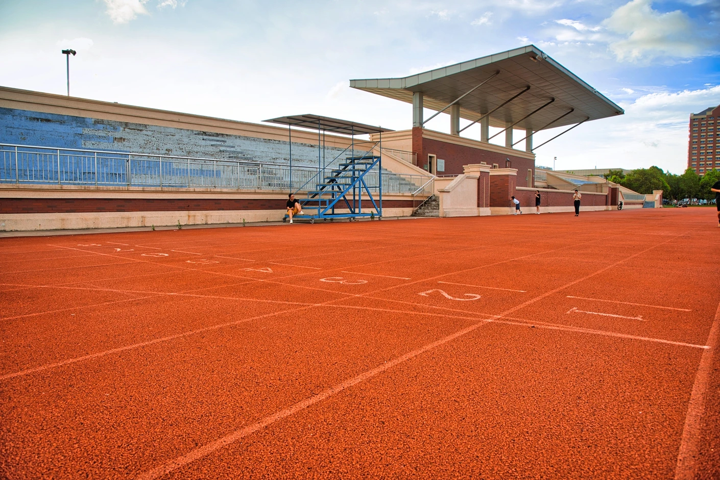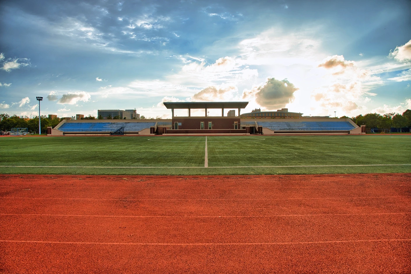 该体育场以180*95 米的开阔空间为基础,打造了集8 跑道标准塑胶田径场与人工草坪 11 人制标准足球场于一体的复合型运动场地,实现了教学、训练与赛事的高效融合。田径场塑胶跑道严格对标专业标准,弹性适中、防滑耐磨,能有效缓冲运动冲击力,为短跑、长跑、跨栏等各类田径项目提供安全专业的保障;足球场人工草坪养护精良,触感柔软且排水性能优异,即便雨后也能快速恢复使用,保障全天候运动需求。场地配置亮点突出,主席台设有专用遮阳棚,为赛事指挥、嘉宾观赛提供舒适环境;场内矗立的国旗旗杆,让每次赛事开幕的升旗仪式更具仪式感,厚植爱国情怀。场地四周配备的15 米高夜间照明灯,光线均匀柔和、无眩光,完全满足夜间教学训练、校园夜跑及赛事活动需求,打破时间限制,极大提升场地利用率。