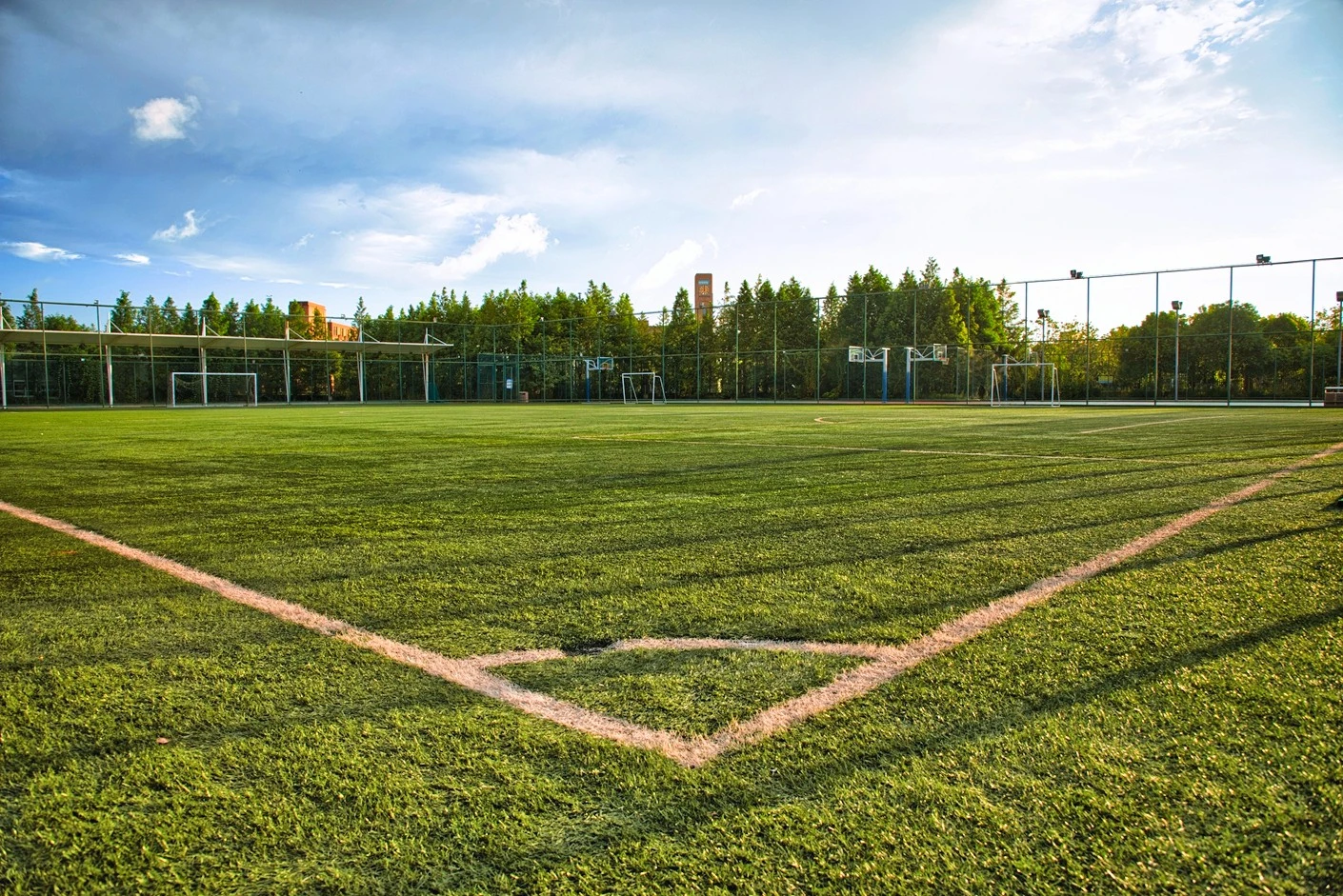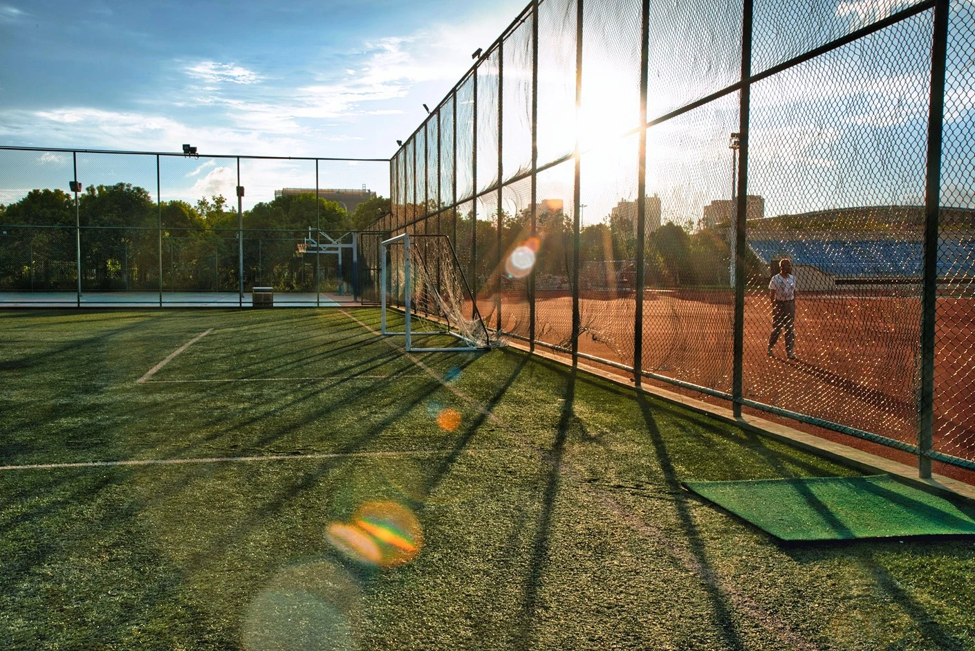 该足球场以62*46 米的规整空间为基础,打造了1 片人工草坪标准 7 人制足球场,场地布局紧凑合理,适配 7 人制赛事的战术节奏与运动需求。人工草坪采用高品质环保材质,表层柔软且弹性适中,能有效缓冲运动冲击,降低急停、变向时的关节损伤风险,同时具备出色的排水性能,即便雨后也能快速恢复使用,保障全天候运动需求。场地四周设置4 米高的坚固铁丝围网,清晰界定运动区域,防止足球飞出场外保障安全,同时隔绝外部干扰,让场内运动者专注投入,围网通透设计也方便场外观众观赏赛事,营造热烈有序的氛围。围网顶部加装的专业夜间照明灯,灯光布局科学均匀、无眩光,可满足夜间教学训练、赛事活动及休闲健身需求,彻底打破日间运动的时间限制,为师生课后参与足球运动提供充足保障。每片场地均配备标准 7 人制球门与清晰的场地标线,完全契合竞赛规则,器材定期检修维护,始终保持良好使用状态。