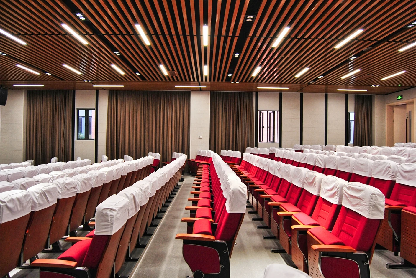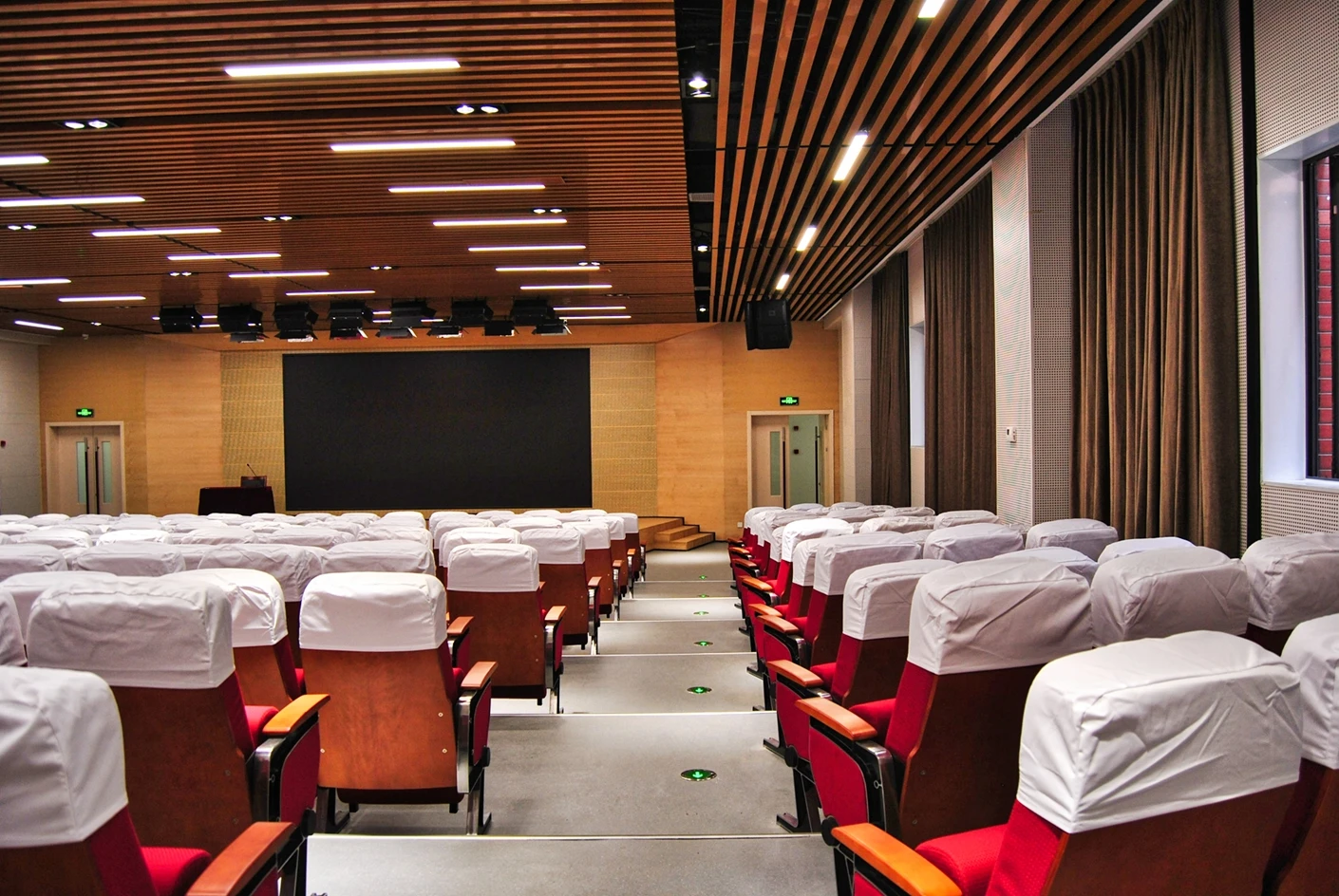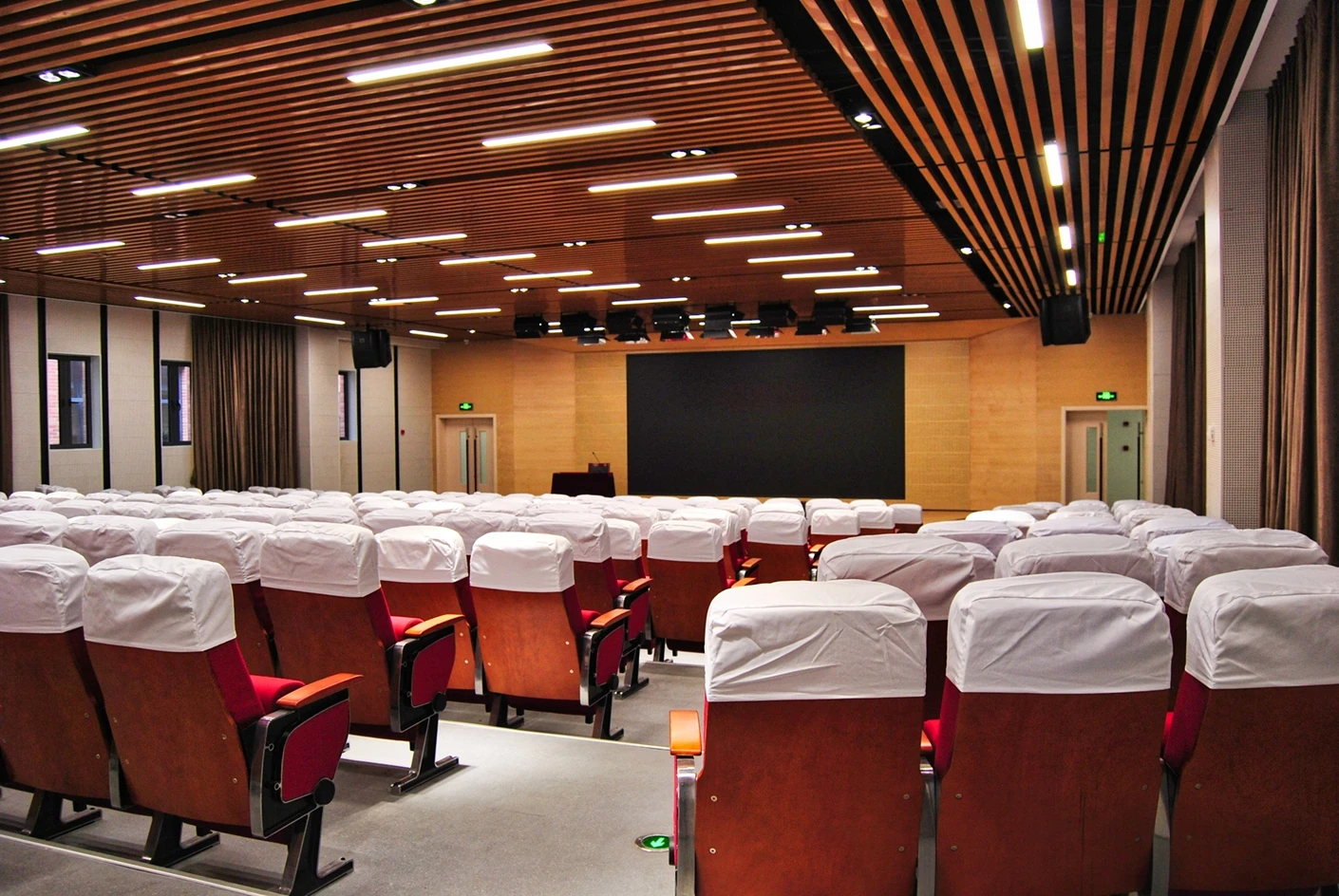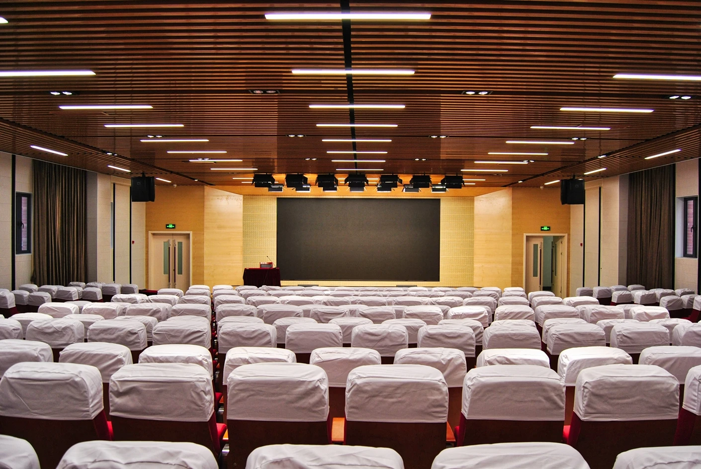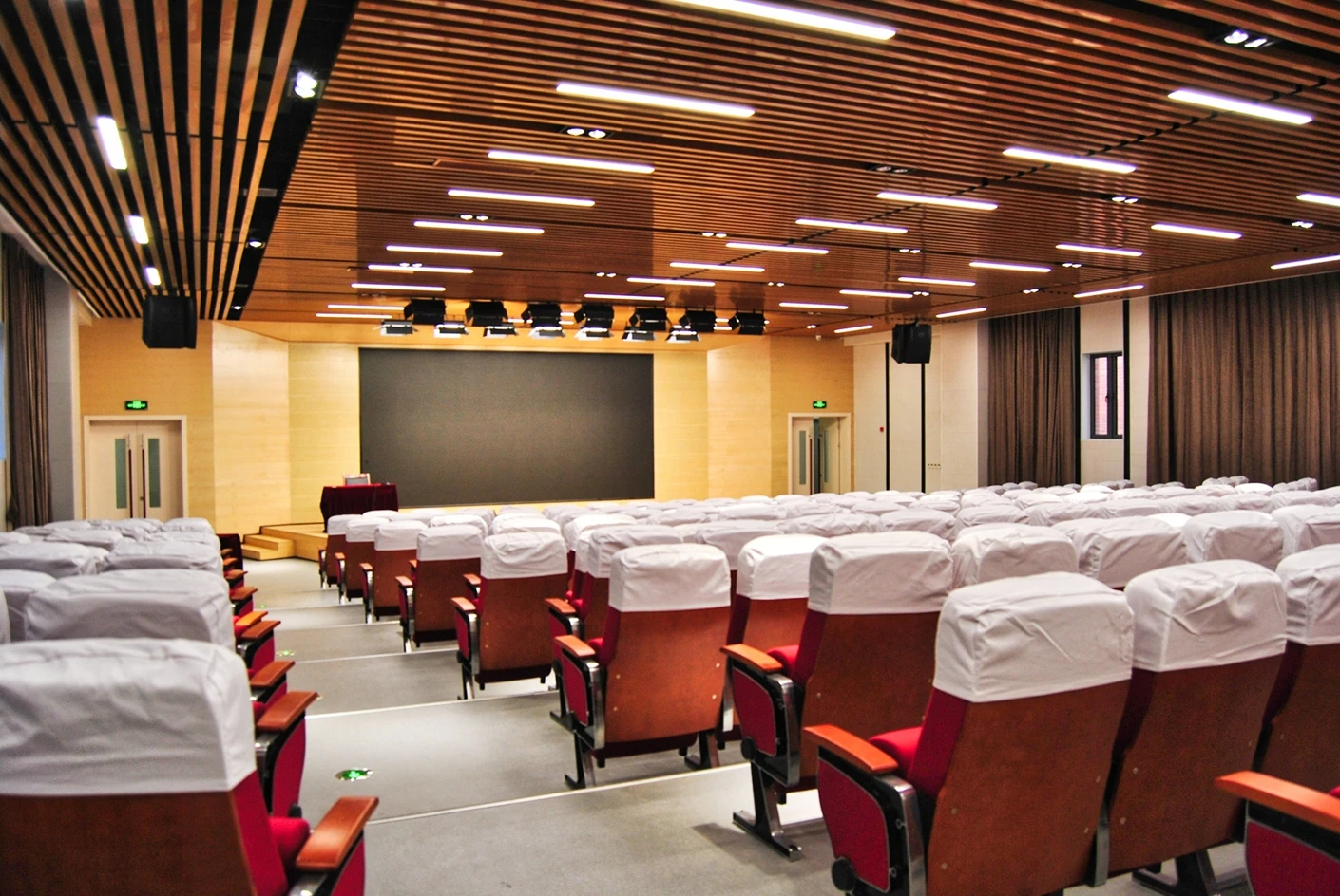 匠兴苑学术报告厅的专业音响系统实现了声场均匀覆盖,会议音响搭配反听设备,既让全场参会者都能清晰接收声音信息,也能让台上的演讲者、表演者实时听到现场音效,提升表达与展示的流畅度;6*2米演讲台台面规整、高度适配,满足各类发言、主持、表演的舞台需求,面光灯则对台上区域进行精准补光,让人物形象与展示内容更清晰,提升整体视觉效果。独立设置的音控室是场地的核心调控枢纽,可实现灯光、音响、大屏、拾音等所有设备的一体化专业调控,无需在活动现场进行临时操作,既保障了设备调控的精准性与高效性,也让活动现场的秩序更整洁,大幅提升活动的执行效率。300个固定座椅按合理间距排布,座椅舒适度高,观影与听音视角俱佳,既适配数小时的学术报告、培训讲座,也能满足赛事活动、文艺展演的全程就坐需求,让参会者拥有良好的体验感。