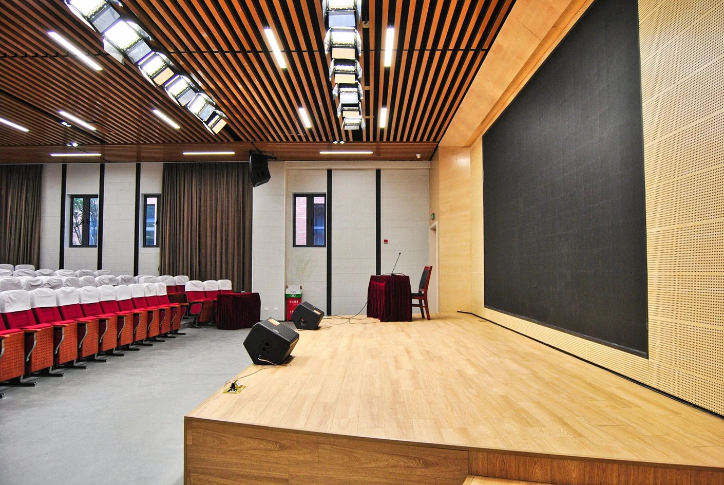 上海东海职业技术学院匠兴苑学术报告厅是校内专业化、多功能的核心室内活动场地,依托学校职业教育发展定位,打造了适配各类学术、会议、赛事活动的标准化空间,台上配齐LED电子主屏、桌麦、话筒、会议音响、反听、6*2米演讲台、面光灯与独立的音控室,台下设置300个固定座椅,软硬件配置兼顾专业性与实用性,可全方位满足校内校外各类中小型活动的开展需求。LED电子主屏支持高清画面显示与多信号接入,能完美适配课件演示、视频播放、图文展示、直播投屏等各类内容输出,满足学术报告、培训讲座的课件展示需求与文艺展演、赛事活动的视觉呈现需求;桌麦与话筒实现舞台全区域拾音覆盖,适配单人演讲、多人座谈、嘉宾互动等多种发言场景,保障声音采集清晰无死角。