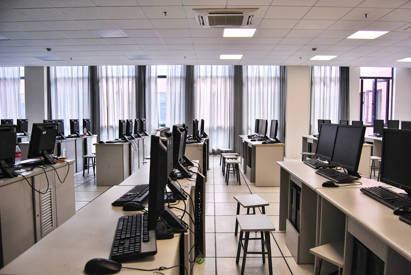 上海东海职业技术学院机房教室坐落于学校主教学楼,是校内规模化、标准化的计算机教学与实训场地,整体规划布局科学,硬件配置统一规范,成为学校开展信息技术类教学、技能培训与考核认证的重要载体。机房教室采用标准化布局设计,单间教室设置8排机位,每排规划8个独立机位,单间可同时满足64人同步开展教学、实训与考试活动,全校共配备20个标准化机房教室,整体可容纳超千名学生同时使用,规模化的场地配置既能够满足全校各专业日常计算机公共课、专业必修课的教学需求,也能承接校内大型技能实训、集中考核认证与校外各类培训考试活动,彻底解决了大规模计算机教学与考核的场地需求。每个独立机位均配备高性能计算机、高清显示屏幕、标准键盘鼠标等全套设备,设备配置贴合职业教育教学与实训需求,能够流畅运行办公软件、专业设计软件、编程开发软件、考试系统等各类教学与考试所需程序,满足不同专业、不同场景的使用需求。